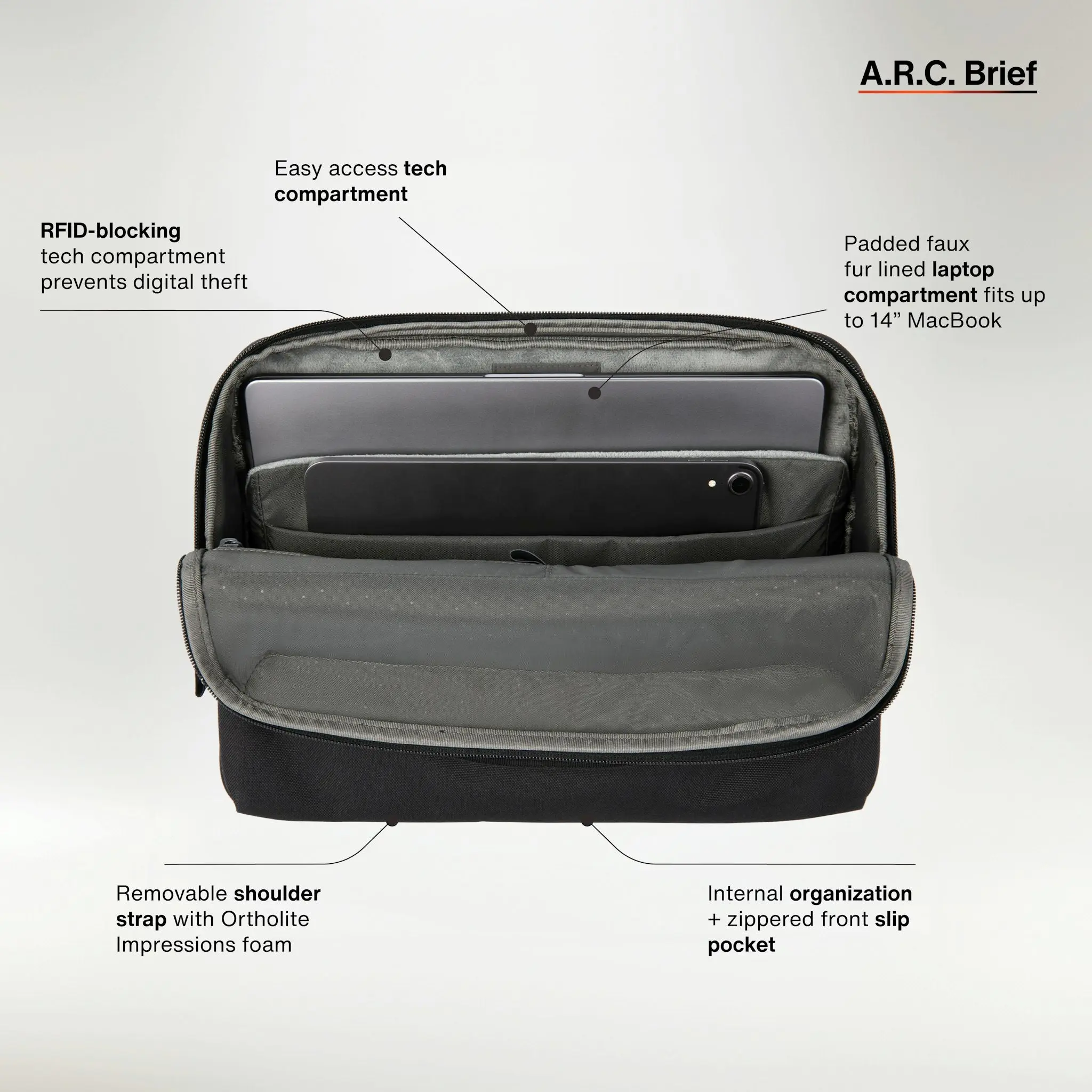 Offering compact organization and intentional mobility for travel or a daily commute, the new A.R.C. Brief is the perfect accessory to carry your tech and personal essentials for whatever the day holds. Soft landing storage for up to 14” laptops and a dedicated padded iPad slip make the Brief easy, intuitive, and unendingly versatile. An additional discreet AirTag storage pocket offers peace of mind to know where your essentials are during day-to-day adventures.